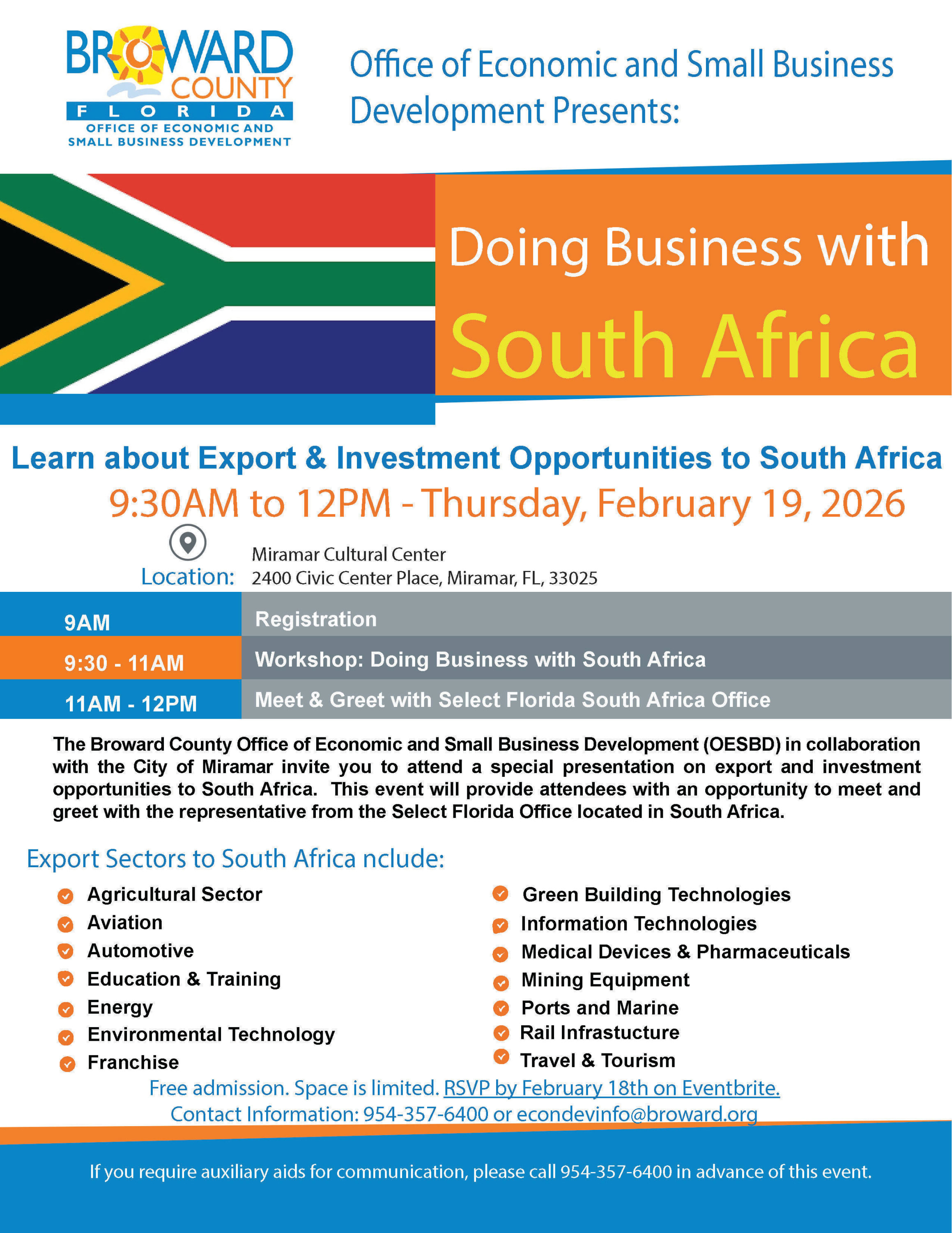 The Broward County Office of Economic and Small Business Development (OESBD) in collaboration with the City of Miramar invite you to attend a special presentation on export and investment opportunities to South Africa. This event will provide attendees with an opportunity to meet and greet with the representative from the Select Florida Office located in South Africa. Free admission. Space is limited. RSVP by February 18th on Eventbrite. Link - https://www.eventbrite.com/e/doing-business-with-south-africa-tickets-1981016834680 Contact Information: 954-357-6400 or econdevinfo@broward.org If you require auxiliary aids for communication, please call 954-357-6400 in advance of this event.Images