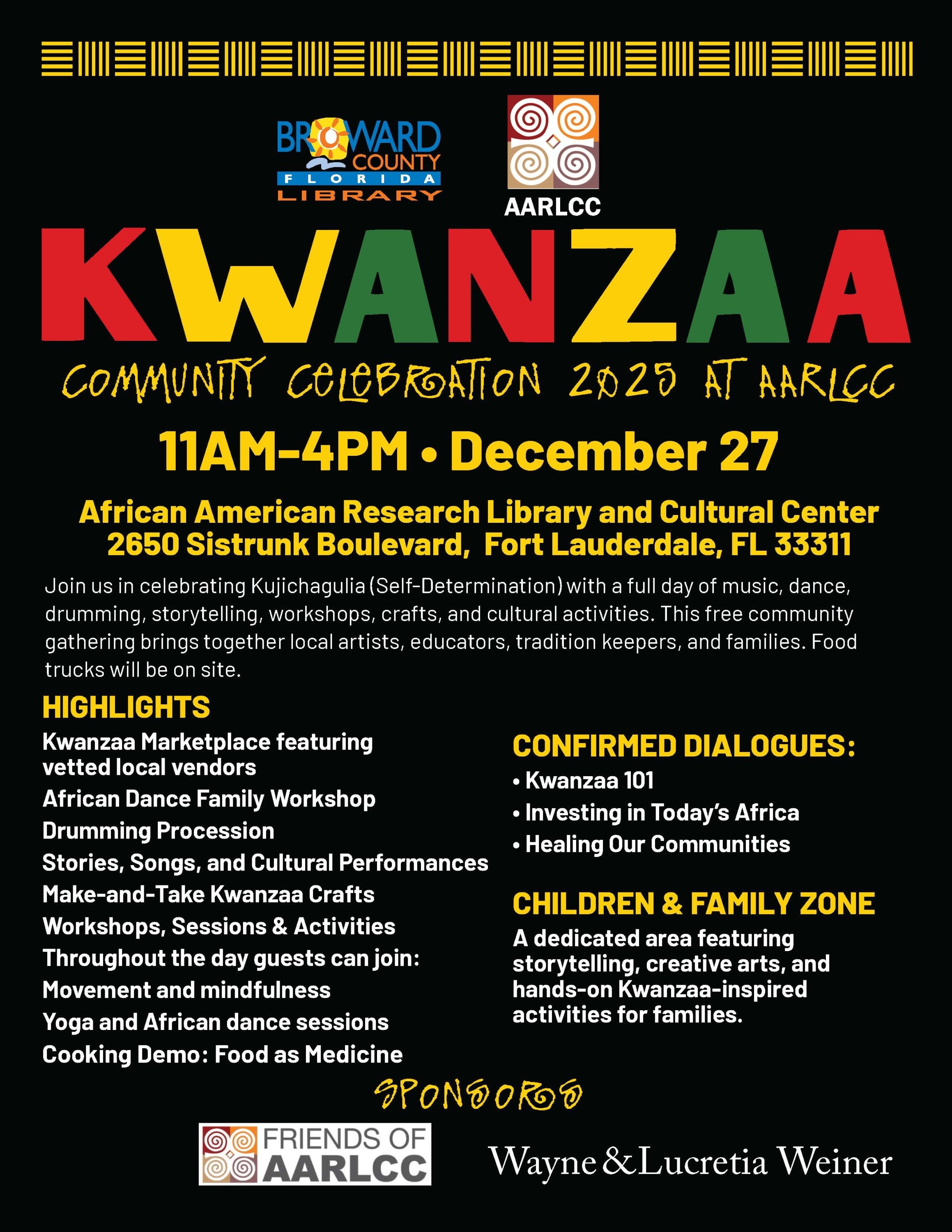 Kwanzaa Community Celebration 2025 is scheduled from 11AM to 4PM, December 27 at Broward County's African American Research Library and Cultural Center (AARLCC), 2650 Sistrunk Blvd., Fort Lauderdale, FL 33311. This free event features music, dance, drumming, dance workshops, crafts, storytelling, songs, giveaways, and treats. Guests can purchase food and beverages from on-site food trucks. Established in 1966, Kwanzaa is a 59-year-old cultural celebration honoring African heritage, community, and values. It is not a religious holiday. Each day of Kwanzaa focuses on one of the Nguzo Saba, the seven principles of African cultures: Umoja (Unity); Kujichagulia (Self-Determination); Ujima (Collective Work and Responsibility); Ujamaa (Cooperative Economics); Nia (Purpose); Kuumba (Creativity); and Imani (Faith). Highlights of AARLCC's Kwanzaa Community Celebration 2025 include: • Kwanzaa Marketplace: Vetted, local vendors with unique items for sale • African Dance Family Workshop • Face Painting • Drumming Procession • Performance: The History of Kwanzaa • Stories and Songs • Make-and-Take Kwanzaa Activities Additional activities throughout the day include movement and mindfulness, yoga and African dance. There will be dialogues on Kwanzaa 101, Investing in Today's Africa, Community and Reparations, Food as Medicine (cooking demo), and Mental Health and Healing. The Children and Family Zone will feature storytelling, creative arts, coding, gardening, and more. The event will also honor seven local leaders or organizations that embody Kwanzaa's founding principles with Nguzo Saba Awards. Anyone may nominate, and community members, colleagues, students, and family members are encouraged to participate. The deadline to submit a nomination is December 6, 2025. This event was generously sponsored by Friends of the African American Research Library and Cultural Center. Admission, parking and all Kwanzaa activities are free; registration is requested. For more information, please contact Ramona La Roche at rlaroche@broward.org, or 954-357-6217. About Broward County Libraries Broward County Libraries Division, named 2020 and 2015 Library of the Year by the Florida Library Association, was founded in 1974 and is one of the largest and busiest library systems in Florida. Broward County Libraries Division's 37 locations provide convenient access to a full range of innovative and cost-effective services that satisfy the changing needs of the people of Broward County for information, education and recreation. Visit our website, Broward.org/Library, or follow Libraries on Facebook and X. November 24, 2025 954-357-5520 LibraryMarketing@Broward.org