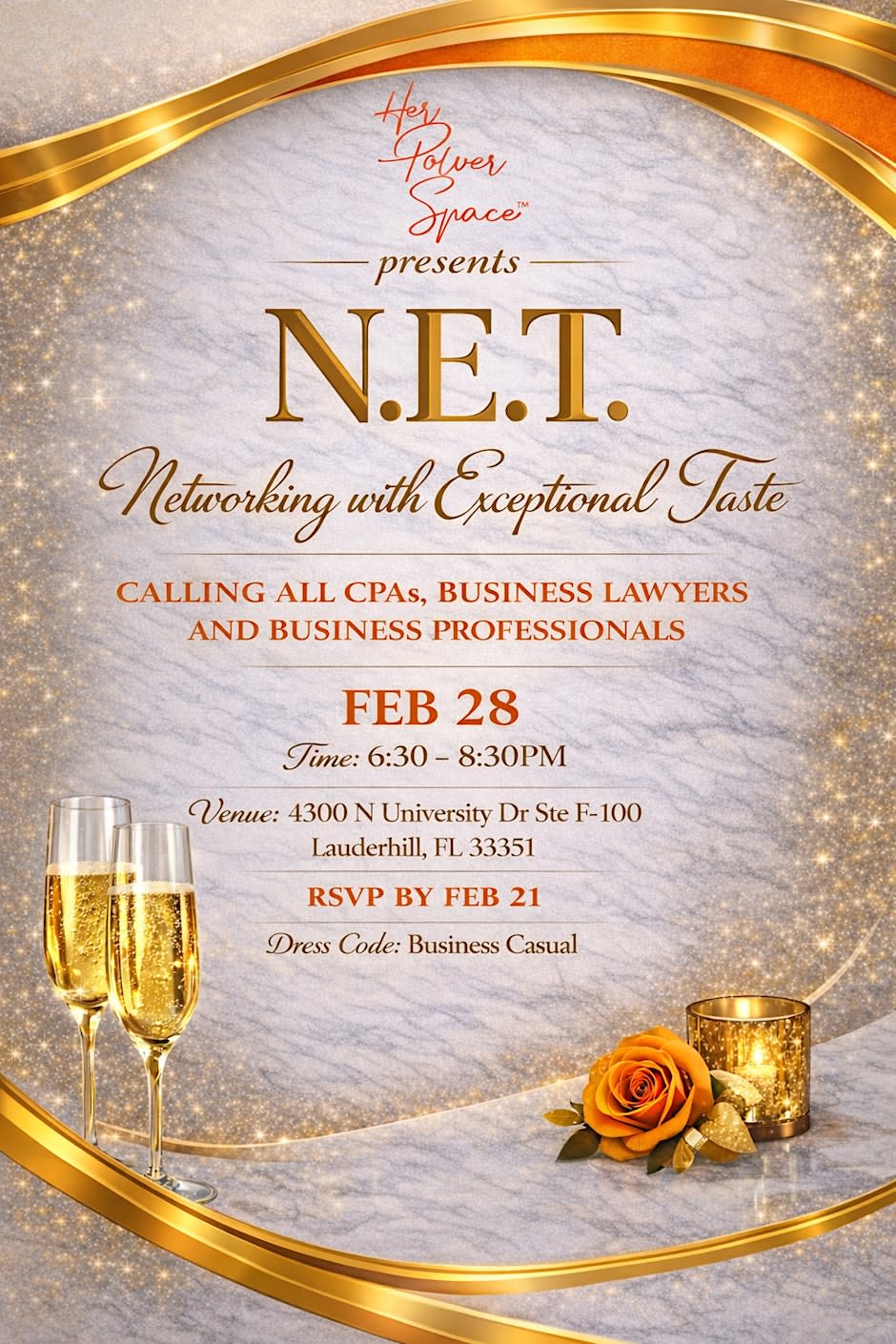 N.E.T. Networking with Exceptional Taste Calling all CPAs, Business Lawyers, and Business Professionals. Hosted by Her Power Space, N.E.T. is an in-person evening designed for meaningful conversations and intentional connections. Join us for an elevated networking experience where refined bites, great energy, and curated company come together in a stylish, welcoming atmosphere. Whether you’re expanding your professional network or simply enjoying the experience, this evening is about connection—with exceptional taste. RSVP - https://www.eventbrite.com/e/net-networking-with-exceptional-taste-tickets-1982327496906?aff=oddtdtcreator